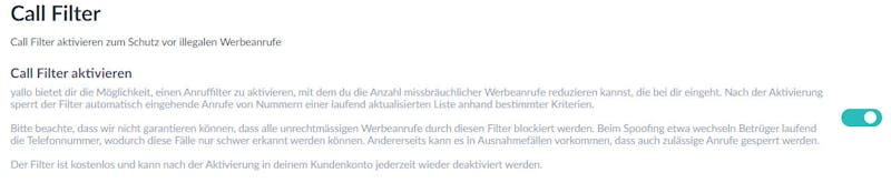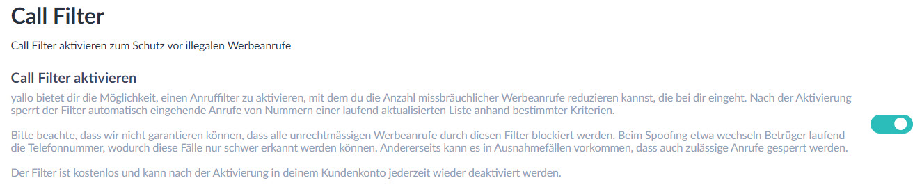 Mit dem Call Filter blockiert yallo automatisch unlautere Anrufe im Mobilnetz. Er funktioniert für alle yallo Mobile Kunden und ist gratis. Es werden alle Nummern gesperrt, die uns von den Behörden (z.B. vom Nationalen Zentrum für Cybersicherheit NCSC des Bundes) gemeldet und als SPAM deklariert wurden. Das sind z.B. Anrufe von Call Centern, die den Sterneneintrag im Telefonbuch nicht respektieren. Es können auch Telefonnummern blockiert werden, die uns oder anderen Telekommunikationsunternehmen direkt gemeldet werden. Der Filter kann auch greifen, wenn eine hohe Anzahl an Anrufen von einer einzigen Nummern in sehr kurzer Zeit erfolgt.