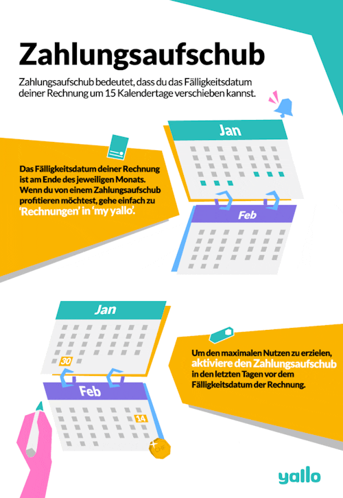 Du findest alle Details zu deinen Rechnungen und der Nutzung in my yallo unter «Rechnungen». Dort kannst du auch einen Zahlungsaufschub aktivieren.