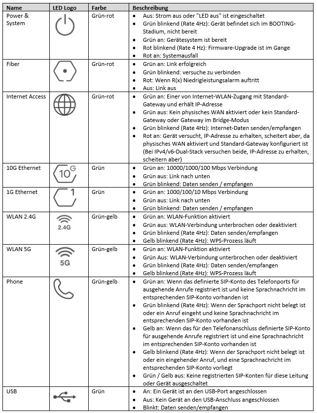 Folgende Tabelle zeigt die verschiedenen LEDs der yallo Home Max Fiber Box an und was sie bedeuten: