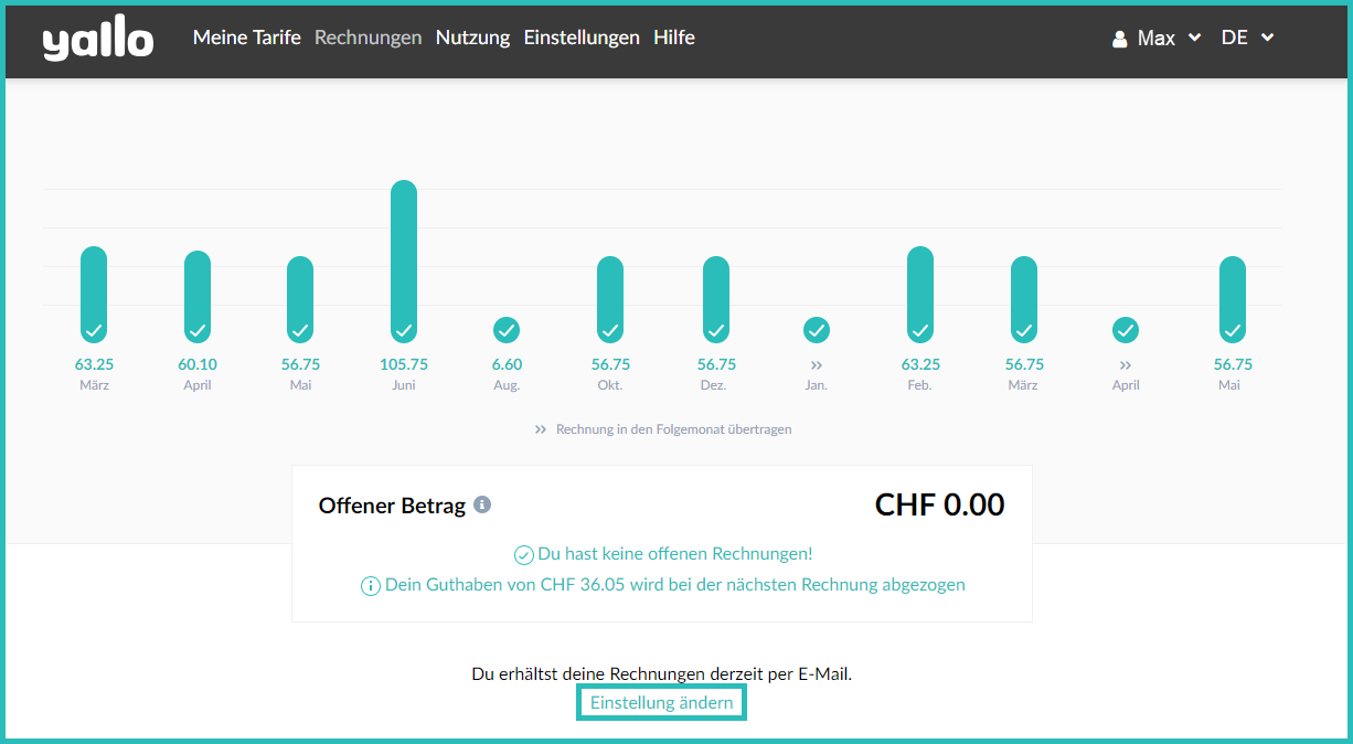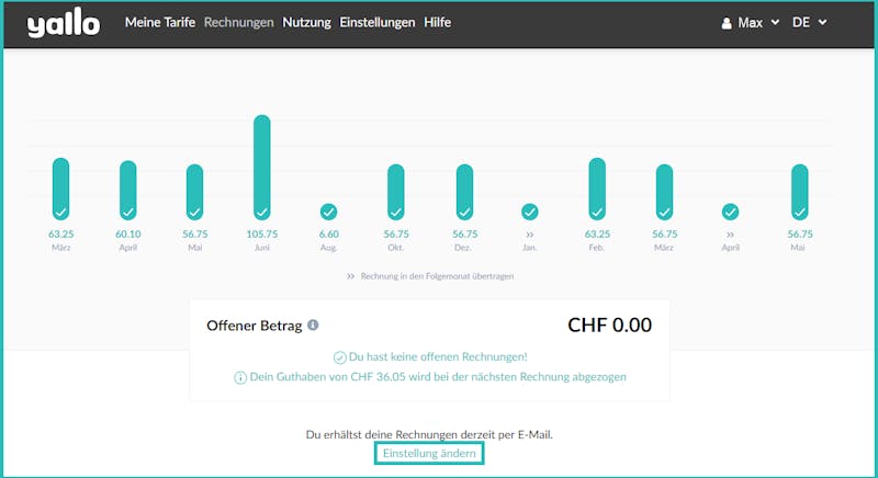 Falls du momentan noch Papierrechnungen erhältst, kannst du das in my yallo unter «Rechnungen und Nutzung» ändern. Die Rechnung per E-Mail ist für dich kostenlos und schont die Umwelt.