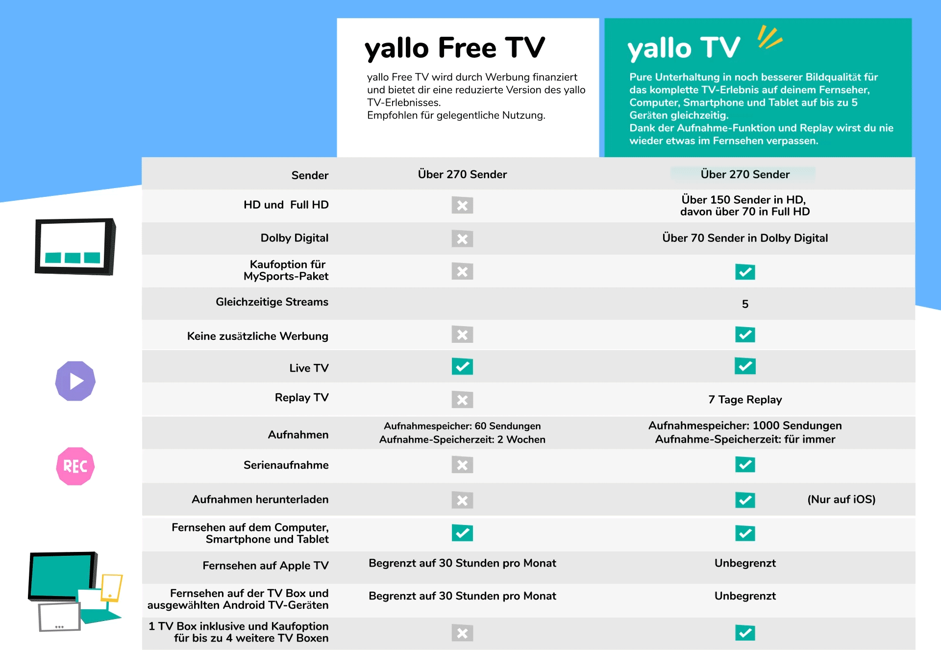 Hier haben wir unsere beiden TV-Produkte für dich verglichen, damit du entscheiden kannst, welches am besten zu dir passt. Während yallo Free TV kostenlos ist, benötigst du für die Nutzung von yallo TV ein Abo. In Kombination mit einem Home Internet + TV erhältst du yallo TV inkludiert.