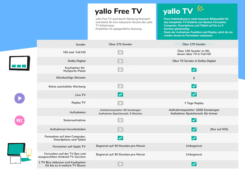 Was ist der Unterschied zwischen yallo Free TV und yallo TV?
