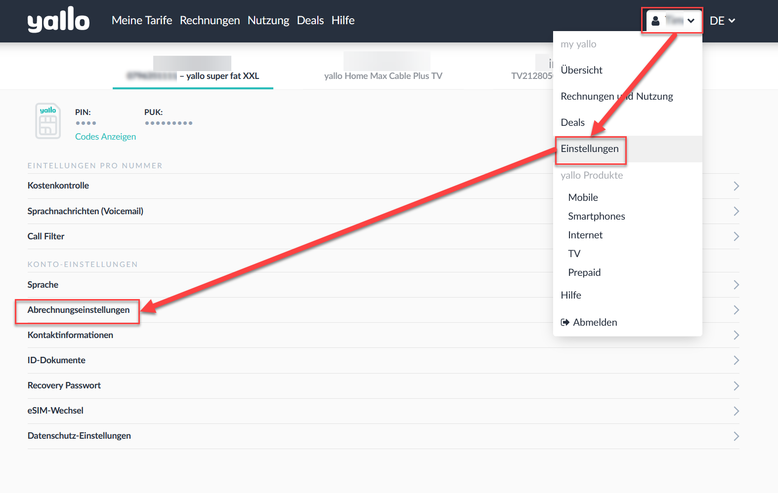 Um die Papierrechnung zu aktivieren oder deaktivieren, gehe auf my yallo. Wähle unter deinem Profil (Name rechts oben) "Einstellungen" und klicke danach auf "Abrechnungseinstellungen":