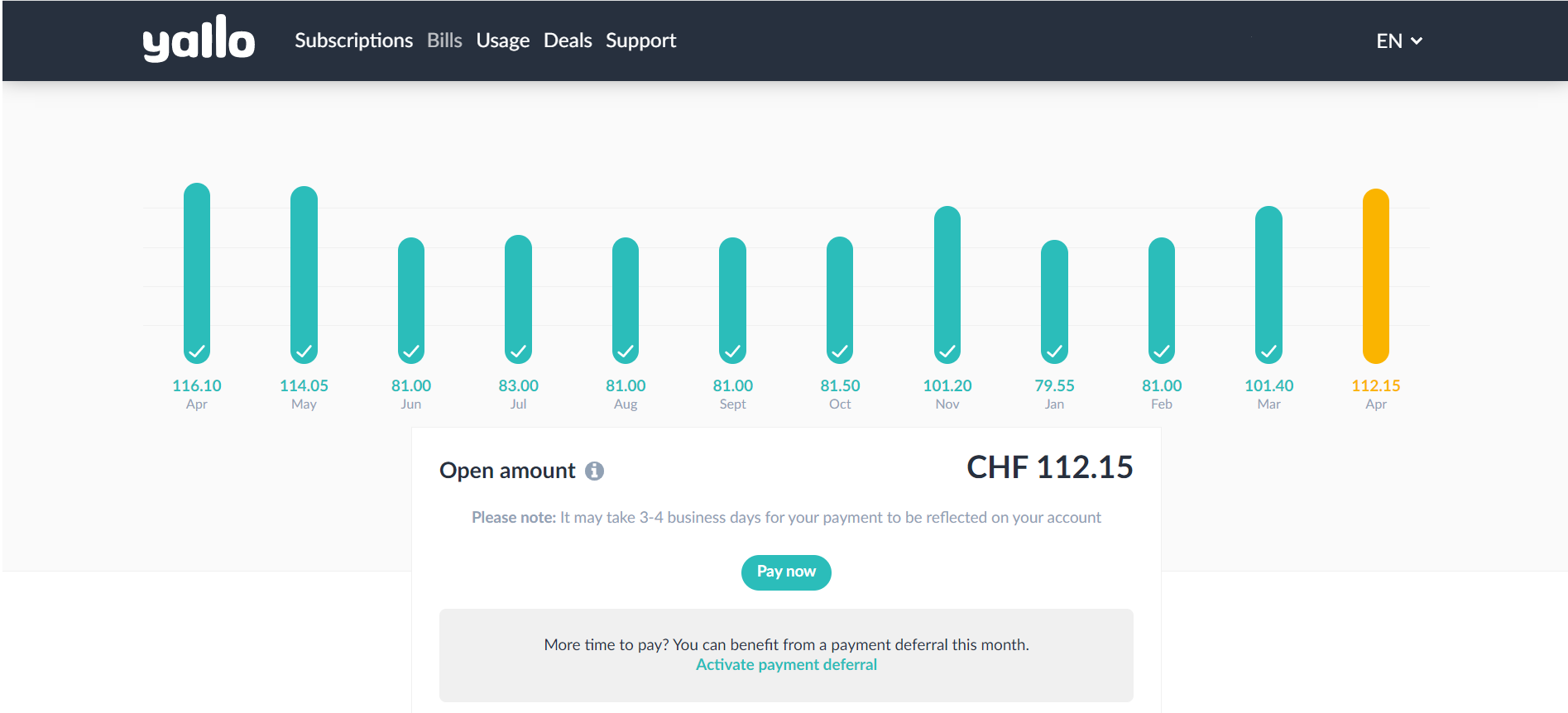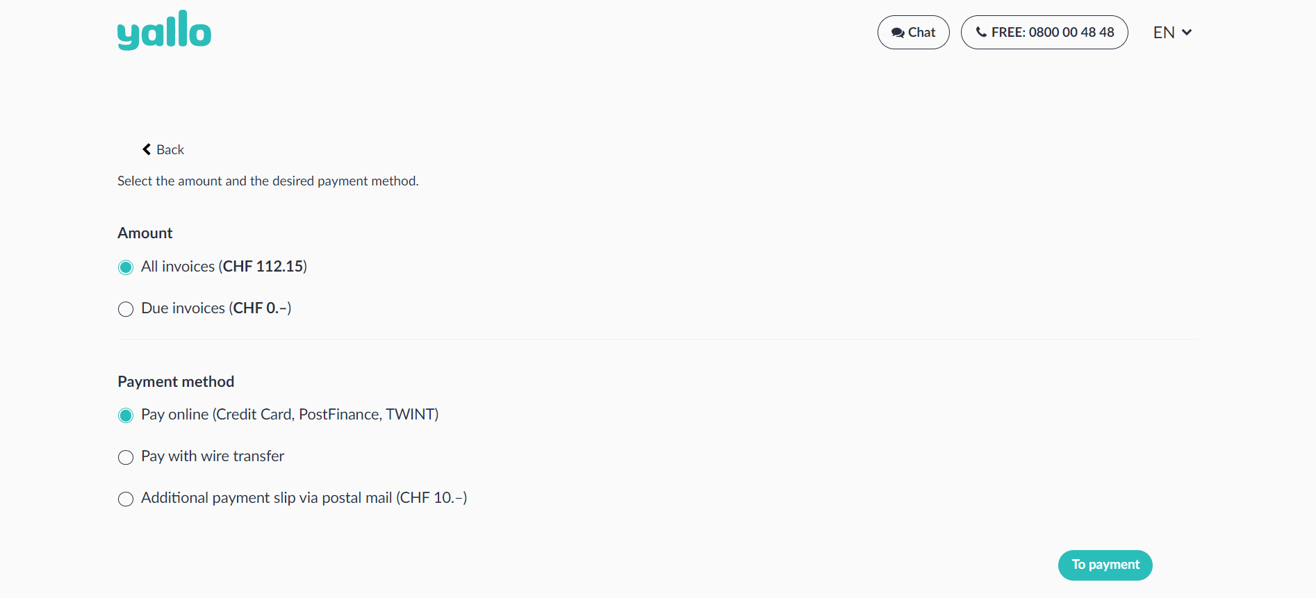 You can pay your bill via Twint. In order to do so, please login into www.yallo.ch/bills and follow these instructions:
