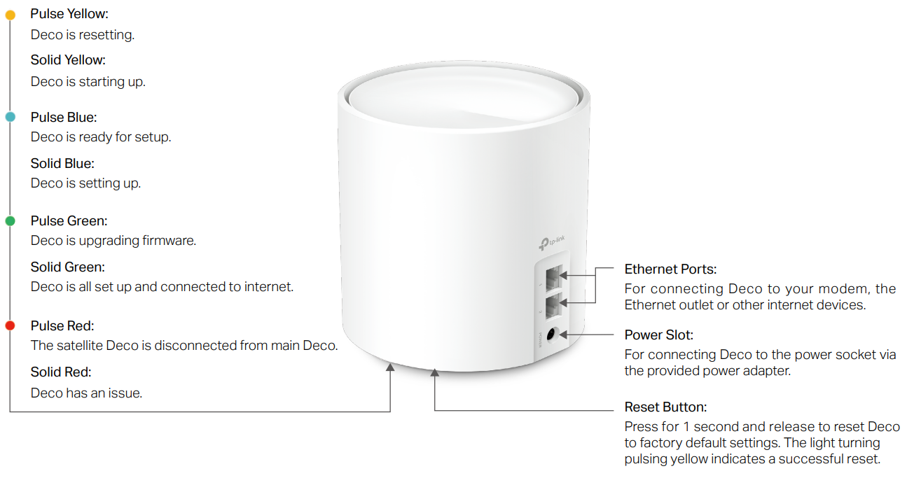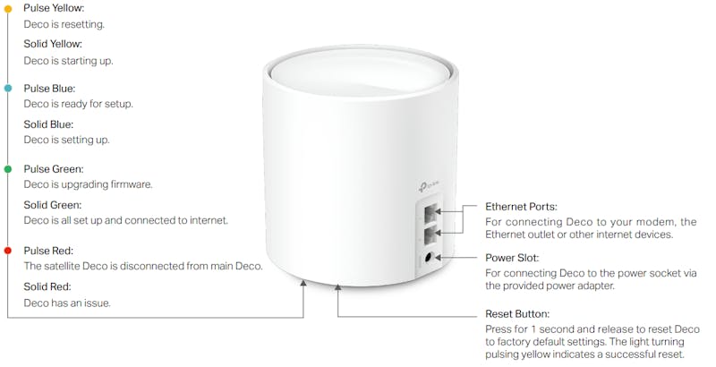 Each Deco has an LED that changes color according to its status, two RJ-45 Ethernet ports, a power slot, and a Reset button. See the explanation below.