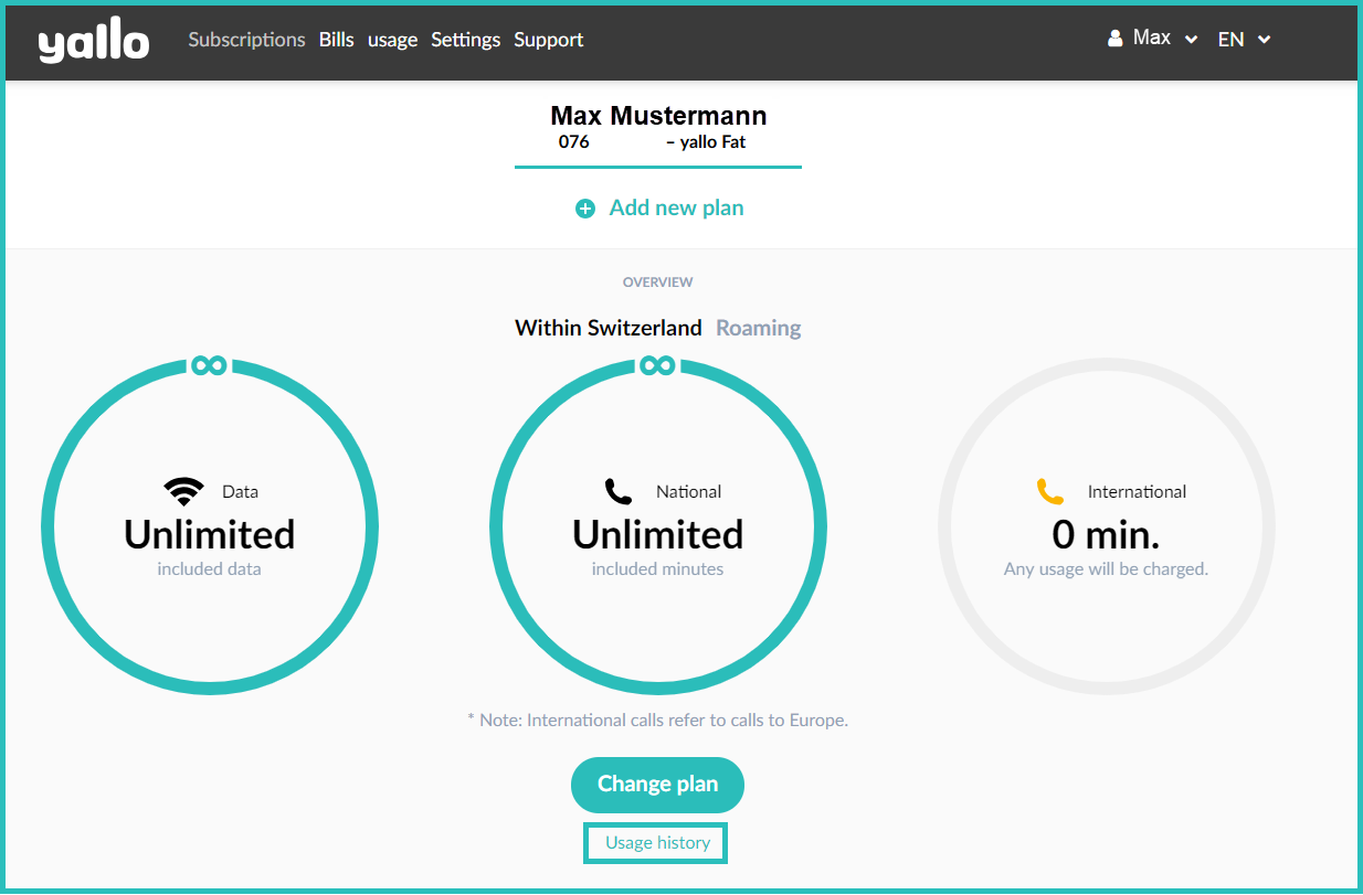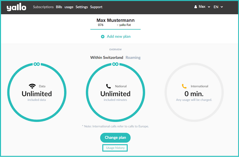 At any time, you can conveniently check online what is included in your plan by looking in my yallo under "Subscriptions". If you have a limited credit, you can also see how much of it has already been used. To see detailed information on your usage, click on "Usage history" below the pie charts.