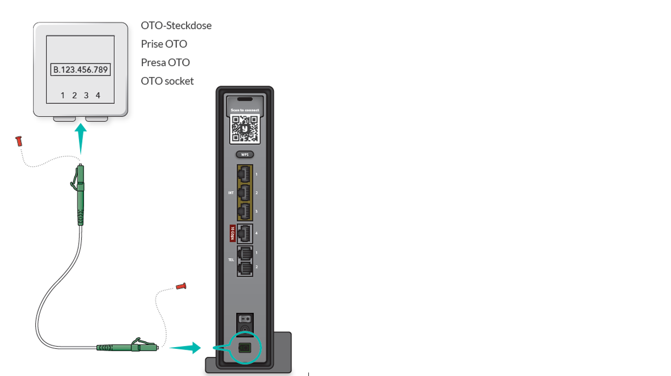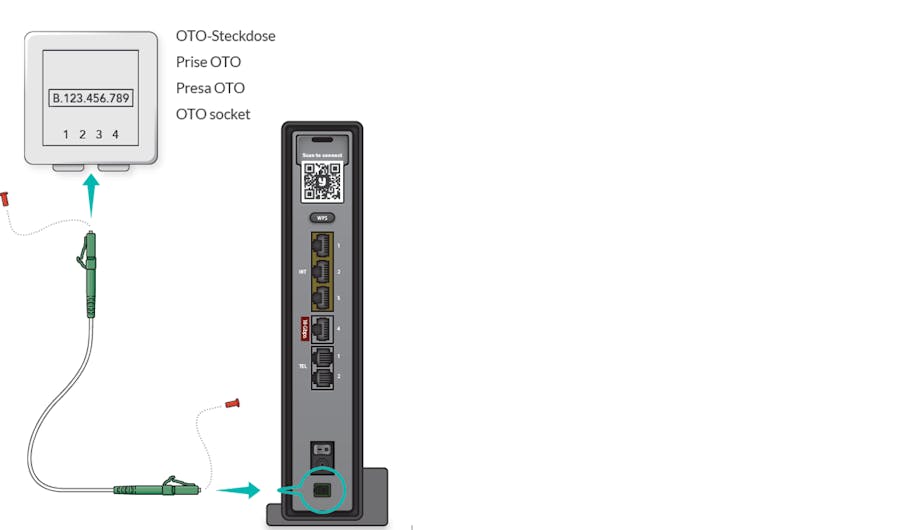 - Open the flap on the fiber optic socket (OTO socket) and connect one end of the fiber optic cable to the designated slot (1-4, as per the activation message).