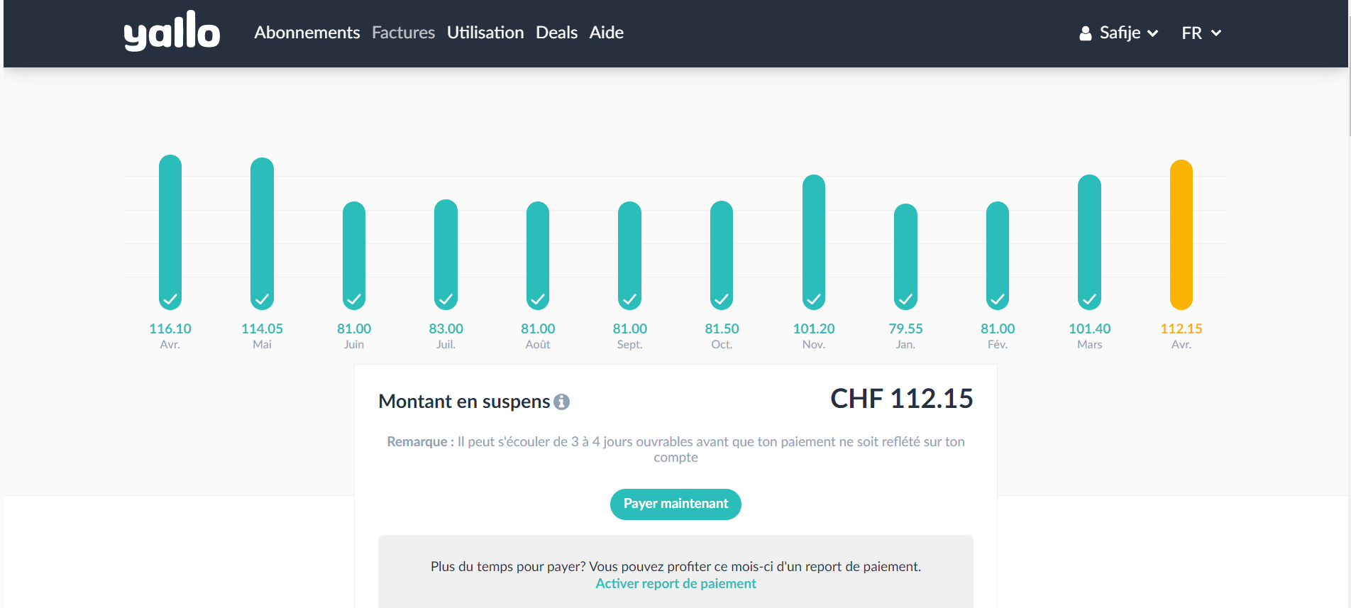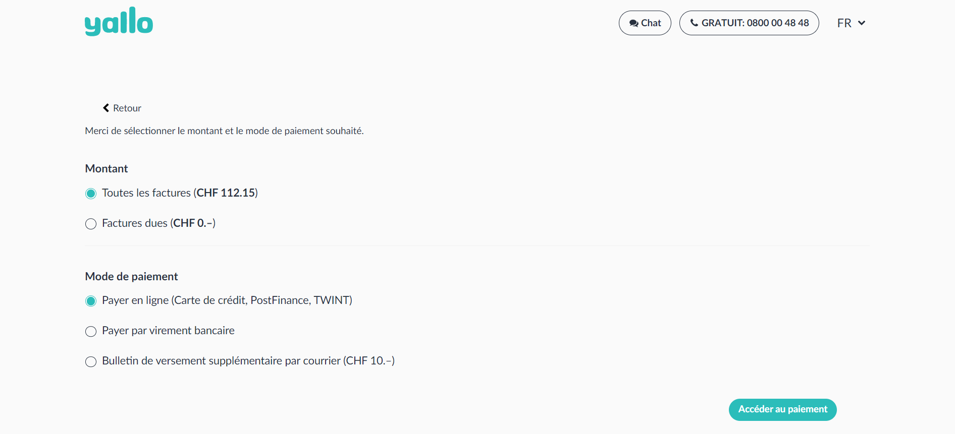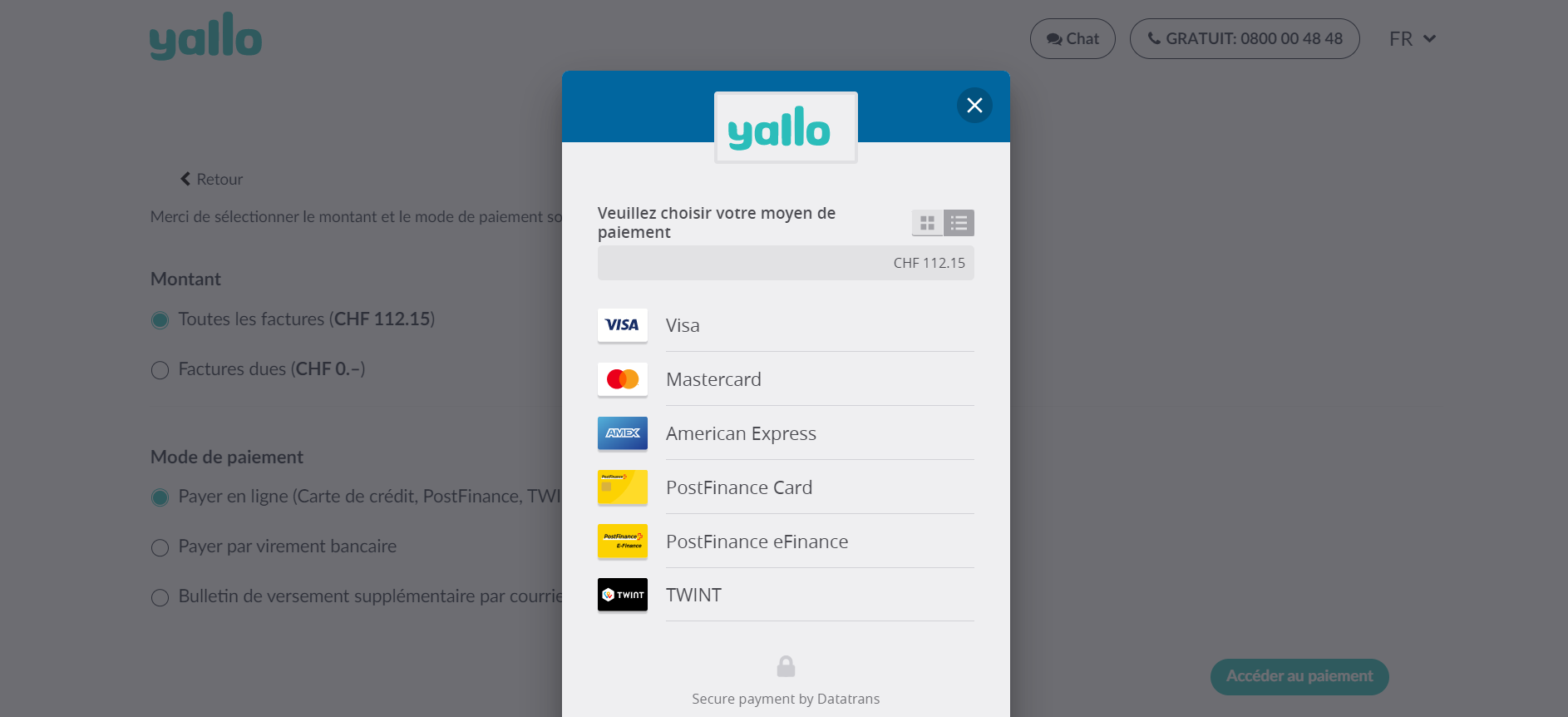 Tu peux payer ta facture via Twint. Pour ce faire, connecte-toi à www.yallo.ch/bills et suis les instructions ci-dessous :