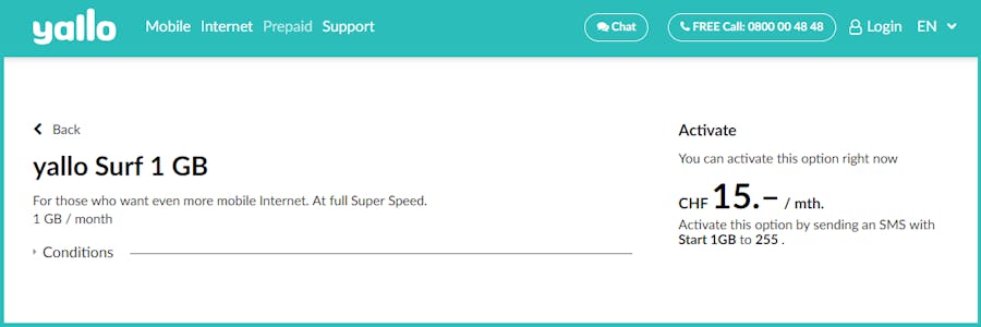 You can find an overview of the available add-on packages here. To activate an add-on package, you only have to send an SMS. To do so, click on the relevant offer and follow the instructions on the right.