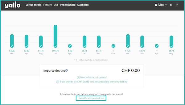 Importante: puoi ricevere le tue fatture solo tramite e-mail se il tuo indirizzo e-mail è verificato. Se in alto nella pagina «Fatture e uso» compare una barra gialla di avviso, il tuo indirizzo e-mail non è ancora confermato. Per eseguire l'operazione, clicca nella barra gialla sul pulsante «Inviare e-mail di convalida».