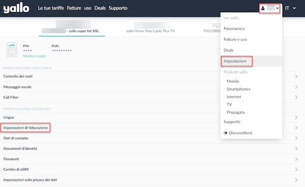 Per attivare o disattivare la fattura cartacea, vai su my yallo. Scegli "Impostazioni" sotto il tuo profilo (nome in alto a destra) e poi clicca su "Impostazioni di fatturazione":