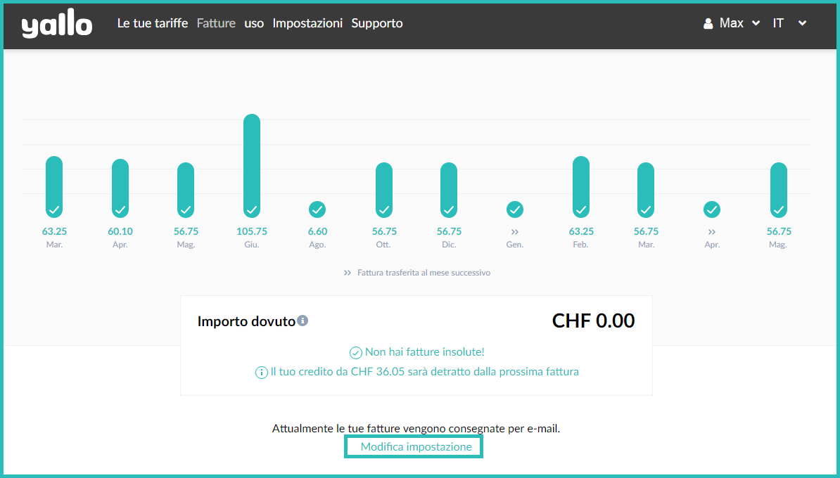 Se attualmente ricevi ancora le fatture cartacee, puoi modificare questa opzione in my yallo sotto «Fatture e uso». La fattura via e-mail è gratuita ed è più ecologica. A tale fine, clicca sul pulsante di scorrimento sul margine destro per selezionare l'opzione di fattura via e-mail. A quel punto il pulsante di scorrimento diventerà colorato.