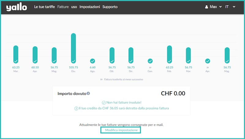 Per farlo, clicca su «Modifica impostazione» sotto il grande pulsante verde (vedi screenshot). Dovrai cliccare sul cursore sul lato destro. Quando poi chiuderai la finestra, sopra «Modifica impostazione» sarà comparsa la nota che da ora riceverai la fattura per e-mail.